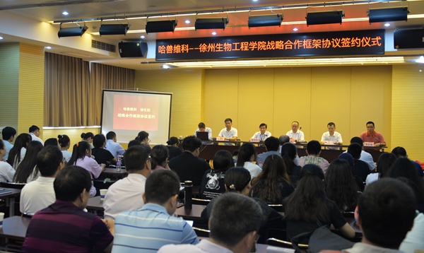 冯力在表达感谢学院给予的荣誉与信任后,表示与我院的务实合作对于哈兽维科下一步发展来说很有意义。他说,徐州是个充满希望的城市,徐州生物工程职业技术学院是个办学悠久的名校,助力产业转型升级、支撑平台强基固本、服务专业立柱架梁就是我们美好合作的初心和使命。他强调,作为兽用生物制品高新技术企业的哈兽维科,今后将与学院手拉手、心连心,心手相应的为集人才培养、学术交流、科技开发、平台共建、资源共享于一体的产学研与人才培养合作基地尽快建成、作用发挥等提供全面支持。冯力最后衷心希望双方合作早结硕果、协同育人再谱新篇。