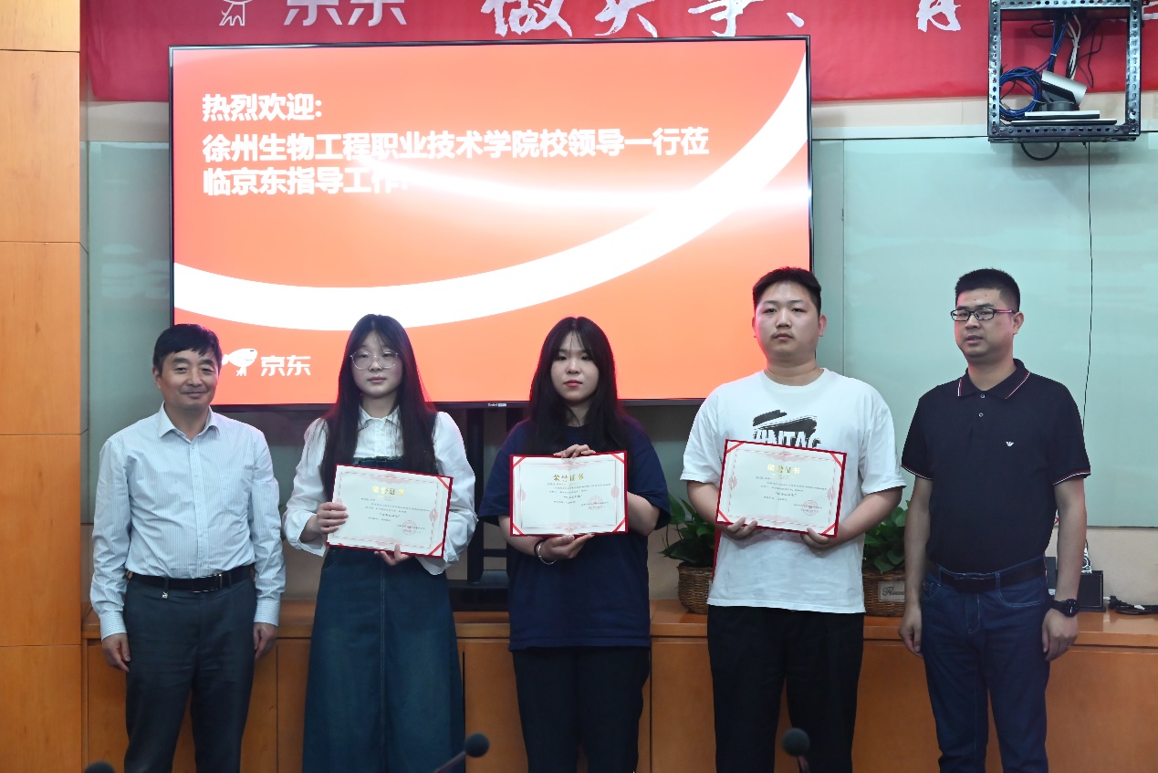 京东零售(宿迁)党委副书记、人才引进部负责人徐旭代表企业对学校秦书记一行表示热烈欢迎,对近年来学校对企业的支持表示感谢,欢迎徐州生物工程职业技术学院更多优秀学子到企业实习就业,干事创业,并对下一步继续深化校企合作提出了建议和设想。秦越华对校企双方在专业建设、人才培养、实习就业等方面开展的合作表示赞赏,并希望在前期合作的基础上,总结经验,固化成果,继续激发双方合作潜力,更好的服务于企业发展、学校专业建设和人才培养。优秀实习生赵呈迪代表我校实习学生发言,校企领导向优秀实习生颁发了证书和奖品。