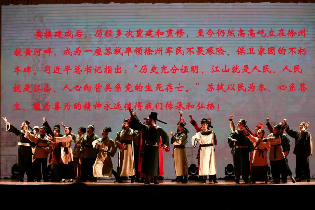 《黄楼丰碑》集诗歌朗诵、古典舞蹈、戏剧表演于一体,生动还原苏东坡任徐州知州时,勇战洪水、坚守城池,最终带领军民抗洪胜利并建造黄楼的故事,彰显了苏轼以民为本、担当为民的情怀。舞台巧用现代科技,逼真复原黄楼盛景,浓郁历史气息扑面而来,让观众仿若置身千年之前。